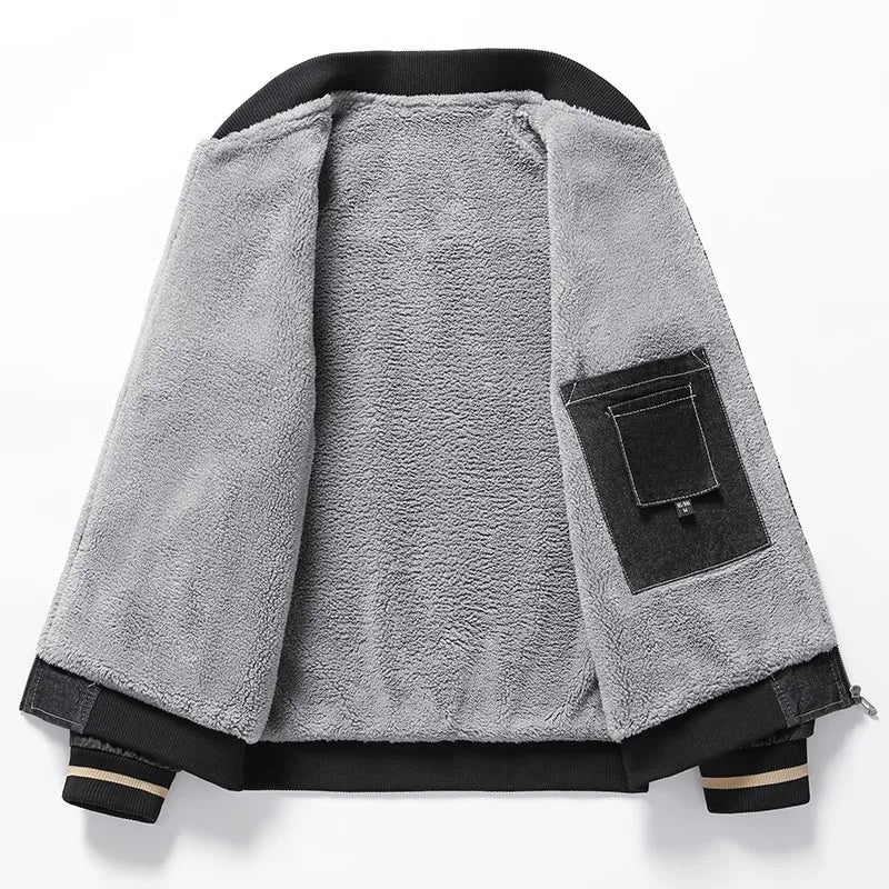 Solidny dżins w nowoczesnym dopasowanym fasonie, ocieplony grubym, ciepłym polarem. Podwójne szwy wykańczają kontury strukturalnej sylwetki, tworząc subtelny akcent, a żółte paski na prążkowanym czarnym wykończeniu, mankietach i kołnierzu dopełniają sportowy wygląd.